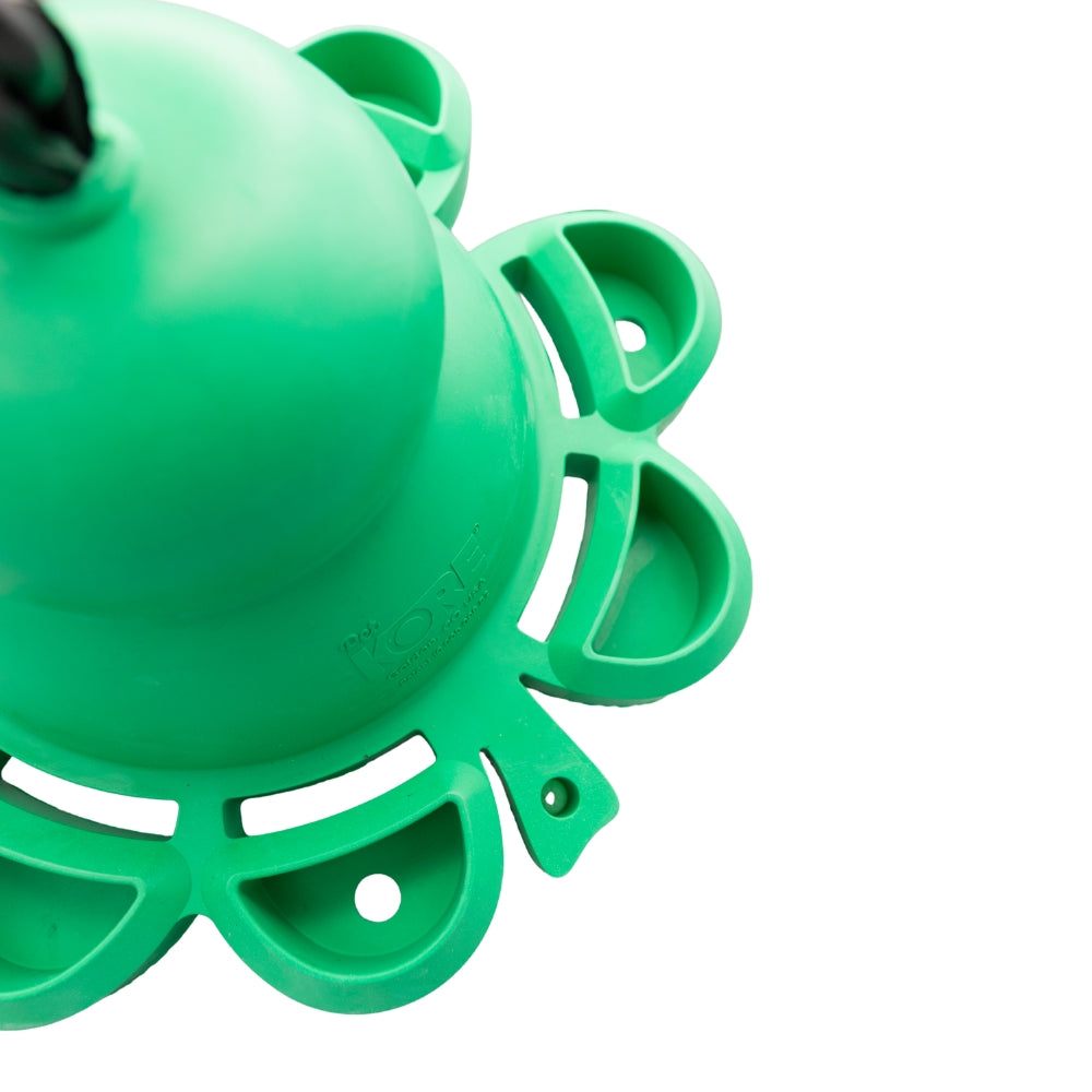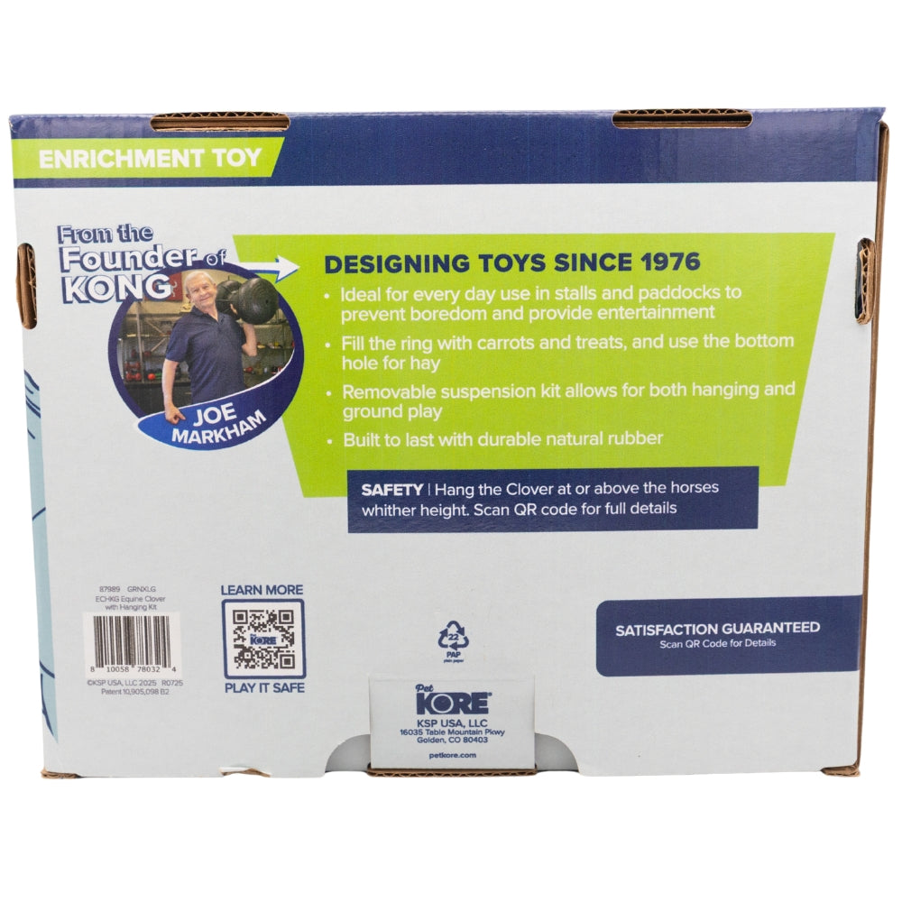 Made from PetKORE’s proprietary natural rubber formula, the Clover Horse Toy is built to last. Its unique clover-shaped design allows you to fill each section with carrots, apple slices, or treats, while the bottom opening can be used for hay. The removable suspension kit gives you the flexibility to hang it for swinging play or place it on the ground for a more natural feeding experience.